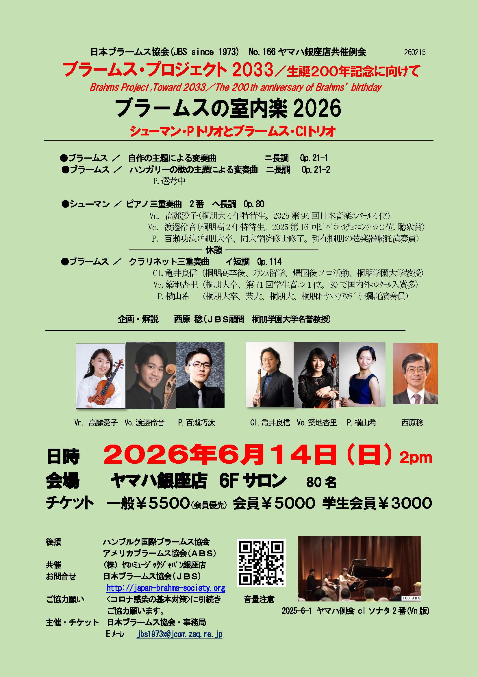 ■例会予告 日本ブラームス協会(JBS since 1973) No.166ヤマハ銀座店共催例会 260215